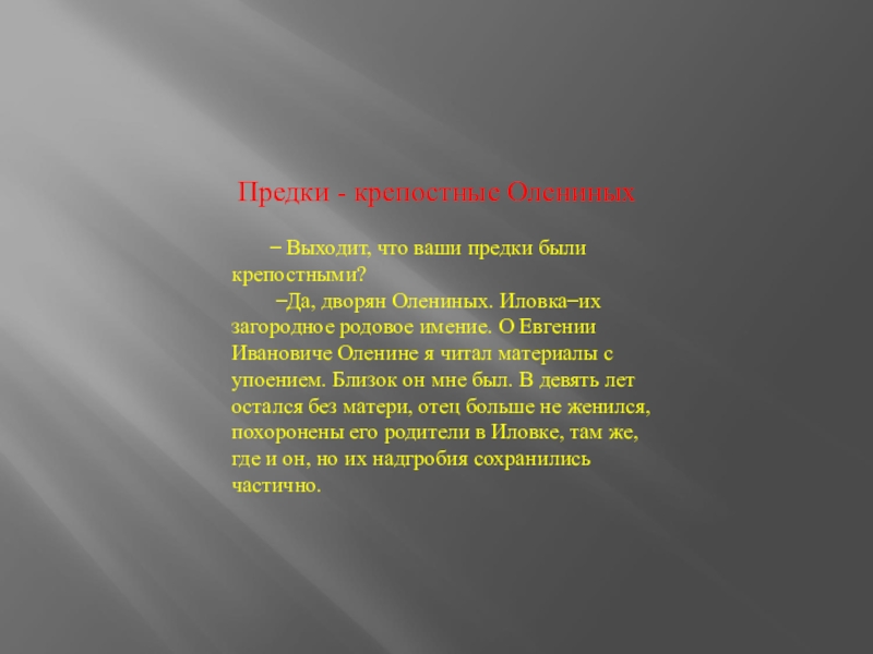 ̶ Да, дворян Олениных. Иловка ̶ их загородное родовое имение. О Евгении Ивановиче Оленине я читал материалы с упоением. Близок он мне был. В девять лет остался без матери, отец больше не женился, похоронены его родители в Иловке, там же, где и он, но их надгробия сохранились частично.