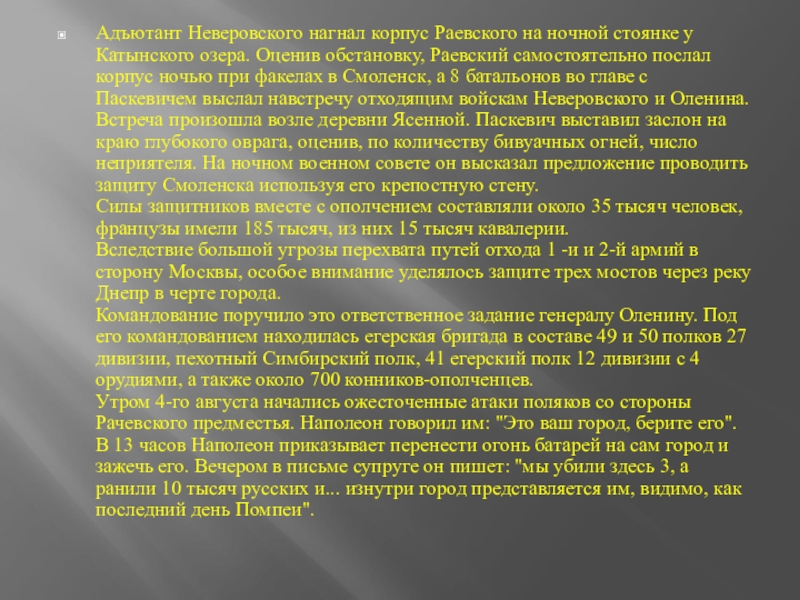 Слайд 43Адъютант Неверовского нагнал корпус Раевского на ночной стоянке у Катынского озера.