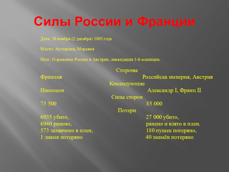 большую часть 21 тыс. - русские. Потери французов, по разным данным, составили 9-12 тыс. человек. После этой битвы австрийский император Франц заявил Александру о том, что продолжать борьбу бессмысленно. Результатом сражения стал выход из войны Австрии и распад Третьей антифранцузской коалиции европейских держав. Россия продолжала войну с Францией в составе Четвертой коалиции.