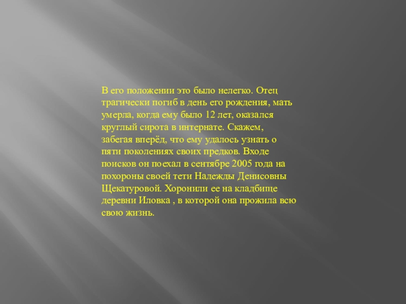его рождения, мать умерла, когда ему было 12 лет, оказался круглый сирота в интернате. Скажем, забегая вперёд, что ему удалось узнать о пяти поколениях своих предков. Входе поисков он поехал в сентябре 2005 года на похороны своей тети Надежды Денисовны Щекатуровой. Хоронили ее на кладбище деревни Иловка , в которой она прожила всю свою жизнь.