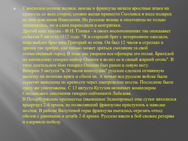 Другой наш земляк - Ф.Н. Глинка - в своих воспоминаниях так описывает события 5 августа 1812 года: "Я и старший брат с нетерпением ожидали, пока выйдет брат наш Григорий из огня. Он был 12 часов в стрелках и дрался так храбро, как только может драться смолянин за свой отечественный город. В этом нас уверили все офицеры его полка. Бригадой их командовал генерал-майор Оленин и водил ее в самый жаркий огонь". В этом длительном бою генерал Оленин был ранен в левую ногу.