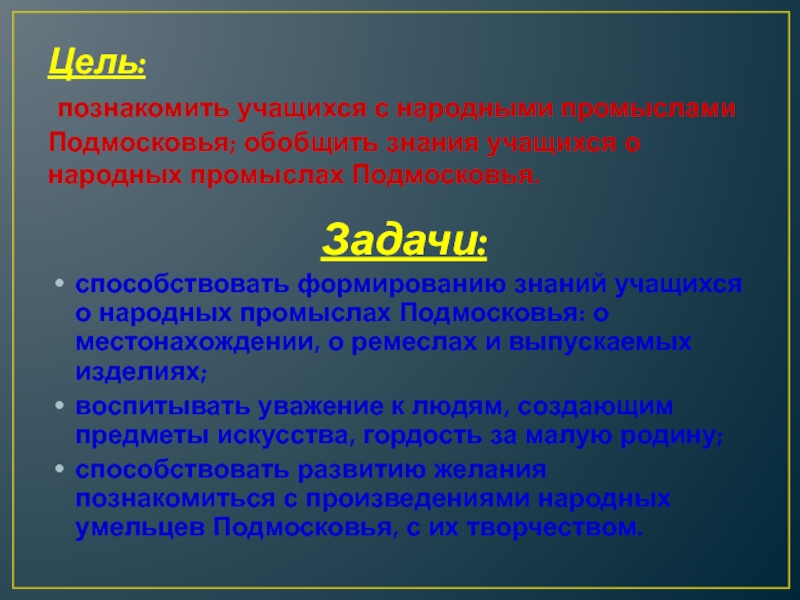 способствовать формированию знаний учащихся о народных промыслах Подмосковья: о местонахождении, о ремеслах и выпускаемых изделиях;