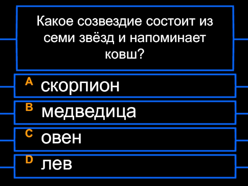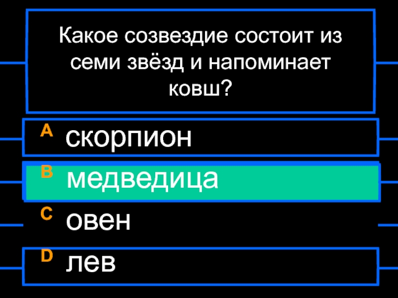 Какое созвездие состоит из семи звёзд и напоминает ковш?A скорпионB медведицаC овенD лев