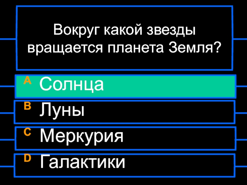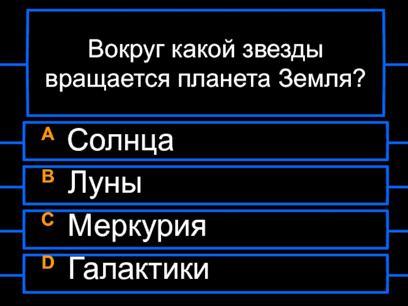 Вокруг какой звезды вращается планета Земля?A СолнцаB ЛуныC МеркурияD Галактики