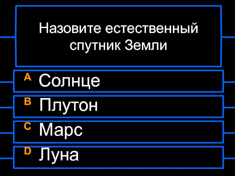 Назовите естественный спутник ЗемлиA СолнцеB ПлутонC МарсD Луна