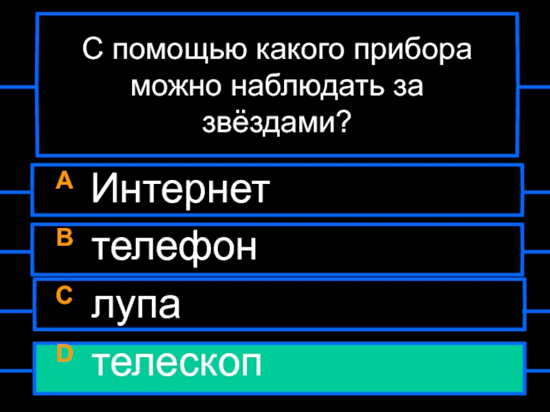 С помощью какого прибора можно наблюдать за звёздами?A ИнтернетB телефонC лупаD телескоп