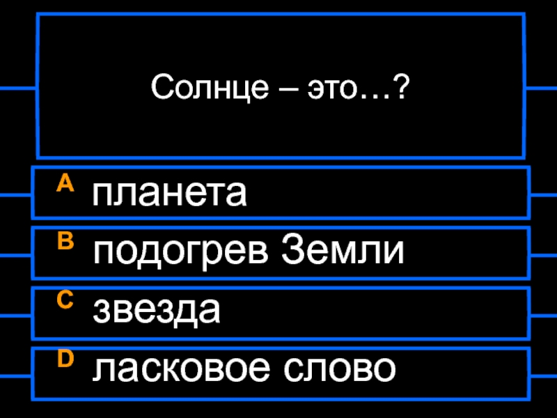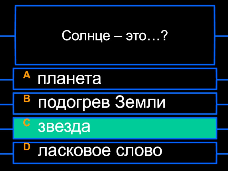 Солнце – это…?A планетаB подогрев ЗемлиC звездаD ласковое слово