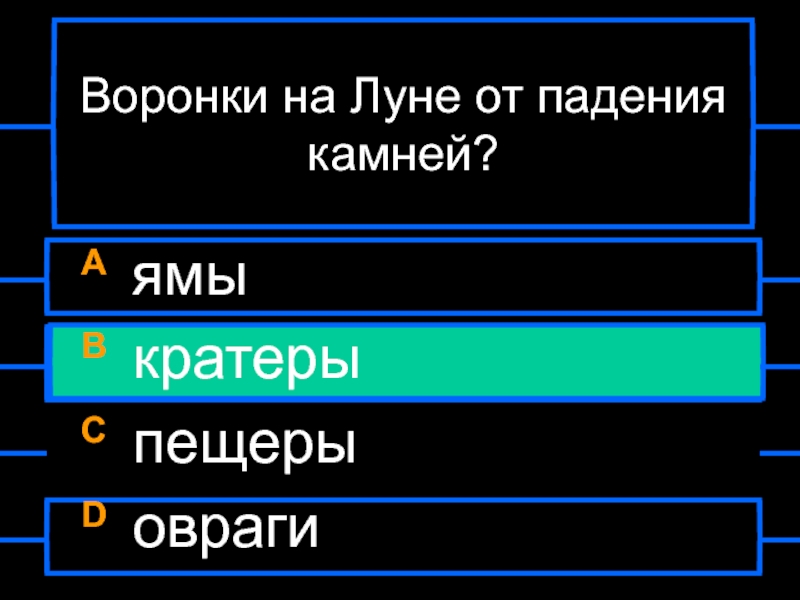 Воронки на Луне от падения камней?A ямыB кратерыC пещерыD овраги