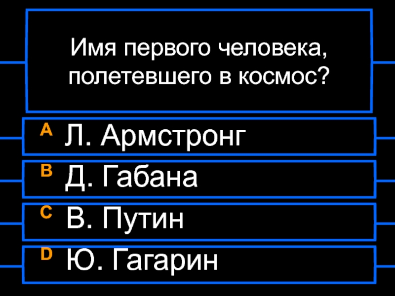 Имя первого человека, полетевшего в космос?A Л. АрмстронгB Д. ГабанаC В. ПутинD Ю. Гагарин