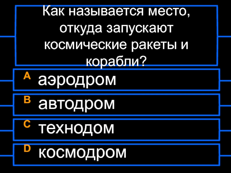 Как называется место, откуда запускают космические ракеты и корабли?A аэродромB автодромC технодомD космодром