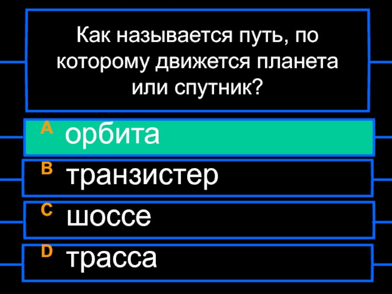Как называется путь, по которому движется планета или спутник? A орбитаB транзистерC шоссеD трасса