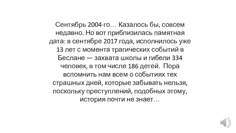 в сентябре 2017 года, исполнилось уже 13 лет с момента трагических событий в Беслане — захвата школы и гибели 334 человек, в том числе 186 детей.  Пора вспомнить нам всем о событиях тех страшных дней, которые забывать нельзя, поскольку преступлений, подобных этому, история почти не знает…