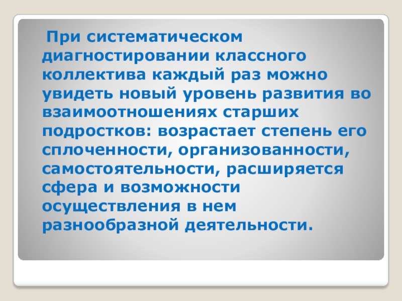 При систематическом диагностировании классного коллектива каждый раз можно увидеть новый уровень развития во взаимоотношениях старших подростков: возрастает степень его сплоченности, организованности, самостоятельности, расширяется сфера и возможности осуществления в нем разнообразной деятельности.