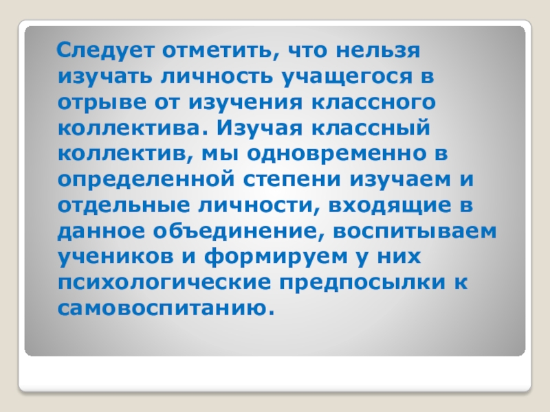 Слайд 3 Следует отметить, что нельзя изучать личность учащегося в отрыве от