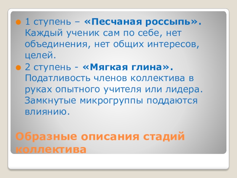 2 ступень - «Мягкая глина». Податливость членов коллектива в руках опытного учителя или лидера. Замкнутые микрогруппы поддаются влиянию.