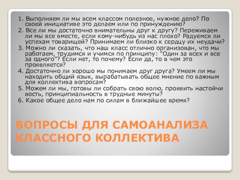 Слайд 5ВОПРОСЫ ДЛЯ САМОАНАЛИЗА КЛАССНОГО КОЛЛЕКТИВА