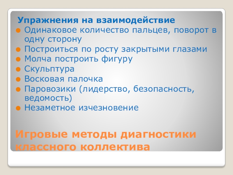 Игровые методы диагностики классного коллектива Упражнения на взаимодействиеОдинаковое количество пальцев, поворот в одну сторону Построиться по росту
