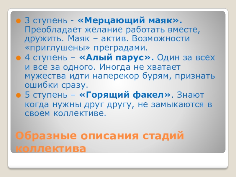 Образные описания стадий коллектива 3 ступень - «Мерцающий маяк». Преобладает желание работать вместе, дружить. Маяк – актив.