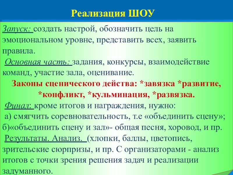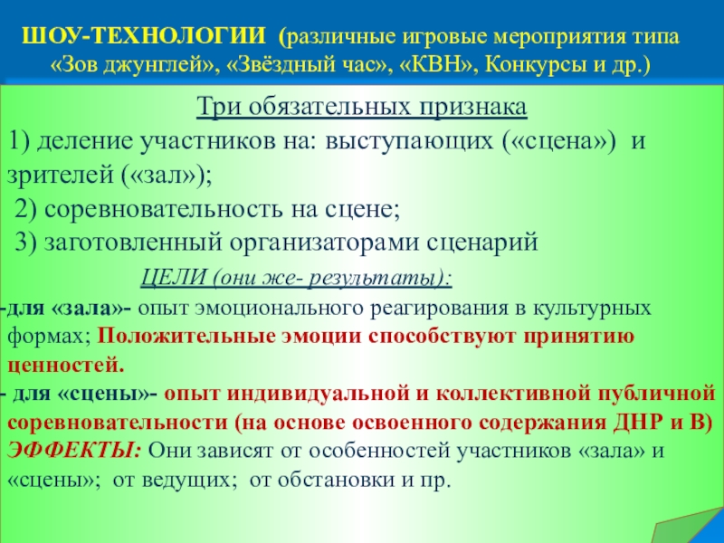 ШОУ-ТЕХНОЛОГИИ (различные игровые мероприятия типа «Зов джунглей», «Звёздный час», «КВН», Конкурсы и др.)