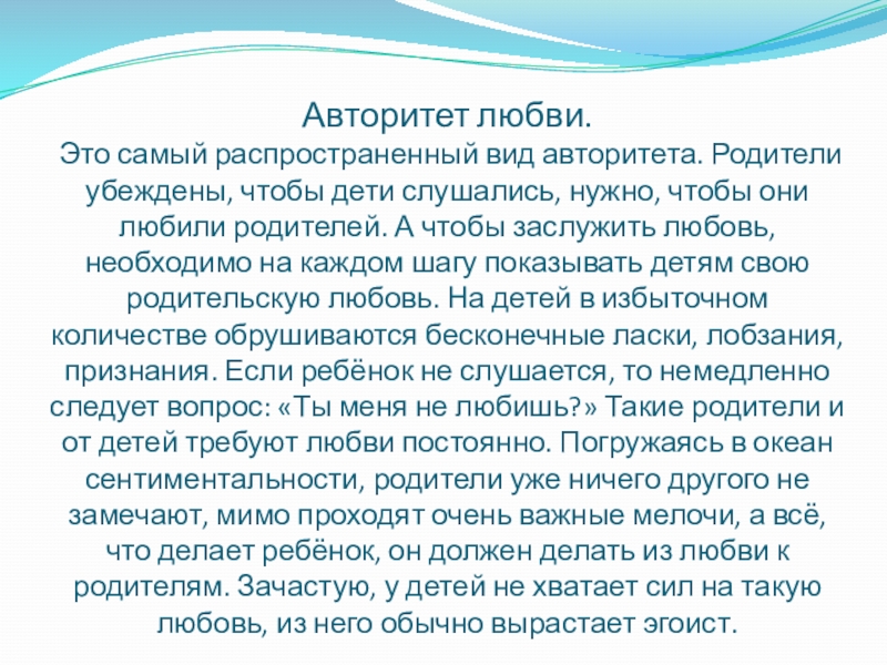 слушались, нужно, чтобы они любили родителей. А чтобы заслужить любовь, необходимо на каждом шагу показывать детям свою родительскую любовь. На детей в избыточном количестве обрушиваются бесконечные ласки, лобзания, признания. Если ребёнок не слушается, то немедленно следует вопрос: «Ты меня не любишь?» Такие родители и от детей требуют любви постоянно. Погружаясь в океан сентиментальности, родители уже ничего другого не замечают, мимо проходят очень важные мелочи, а всё, что делает ребёнок, он должен делать из любви к родителям. Зачастую, у детей не хватает сил на такую любовь, из него обычно вырастает эгоист.