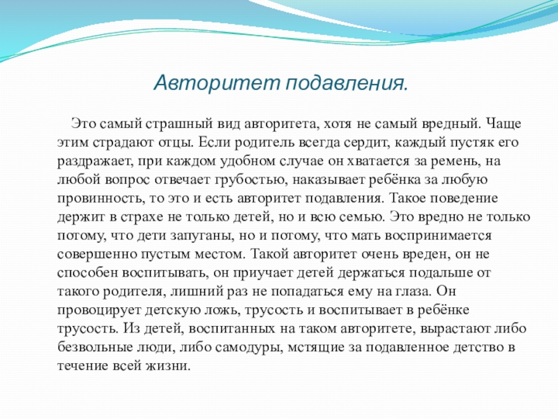 самый вредный. Чаще этим страдают отцы. Если родитель всегда сердит, каждый пустяк его раздражает, при каждом удобном случае он хватается за ремень, на любой вопрос отвечает грубостью, наказывает ребёнка за любую провинность, то это и есть авторитет подавления. Такое поведение держит в страхе не только детей, но и всю семью. Это вредно не только потому, что дети запуганы, но и потому, что мать воспринимается совершенно пустым местом. Такой авторитет очень вреден, он не способен воспитывать, он приучает детей держаться подальше от такого родителя, лишний раз не попадаться ему на глаза. Он провоцирует детскую ложь, трусость и воспитывает в ребёнке трусость. Из детей, воспитанных на таком авторитете, вырастают либо безвольные люди, либо самодуры, мстящие за подавленное детство в течение всей жизни.