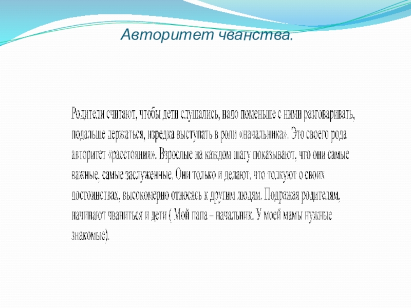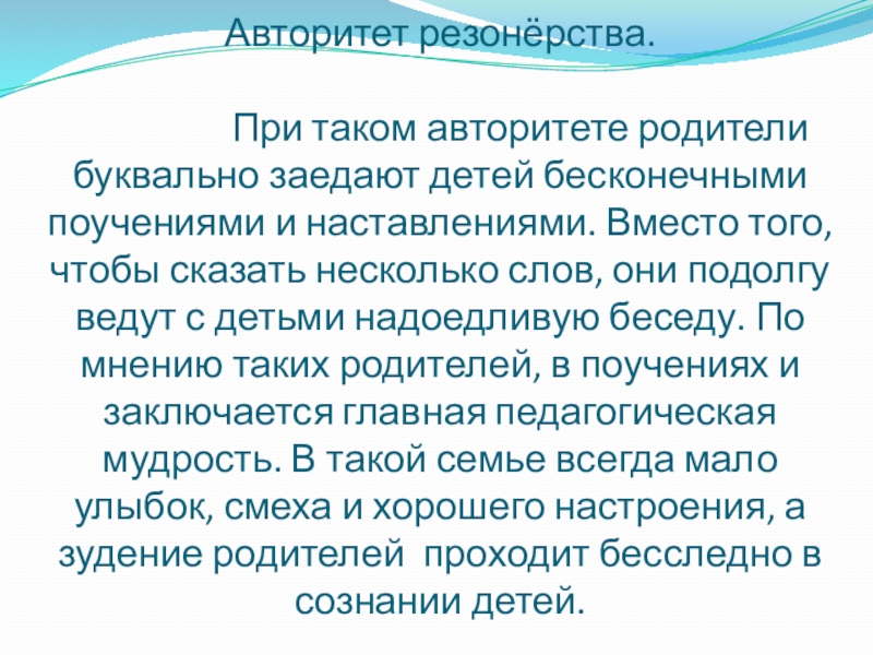 таком авторитете родители буквально заедают детей бесконечными поучениями и наставлениями. Вместо того, чтобы сказать несколько слов, они подолгу ведут с детьми надоедливую беседу. По мнению таких родителей, в поучениях и заключается главная педагогическая мудрость. В такой семье всегда мало улыбок, смеха и хорошего настроения, а зудение родителей проходит бесследно в сознании детей.