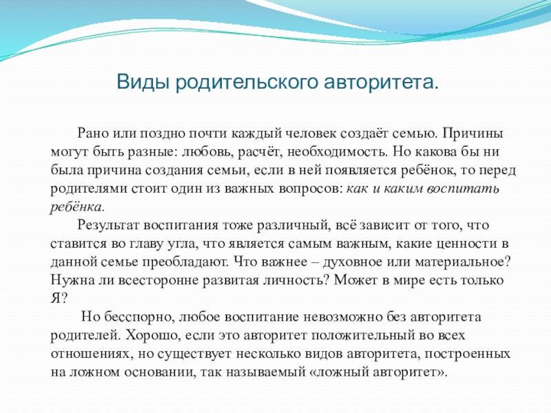 Но бесспорно, любое воспитание невозможно без авторитета родителей. Хорошо, если это авторитет положительный во всех отношениях, но существует несколько видов авторитета, построенных на ложном основании, так называемый «ложный авторитет».