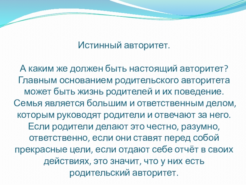 может быть жизнь родителей и их поведение. Семья является большим и ответственным делом, которым руководят родители и отвечают за него. Если родители делают это честно, разумно, ответственно, если они ставят перед собой прекрасные цели, если отдают себе отчёт в своих действиях, это значит, что у них есть родительский авторитет.