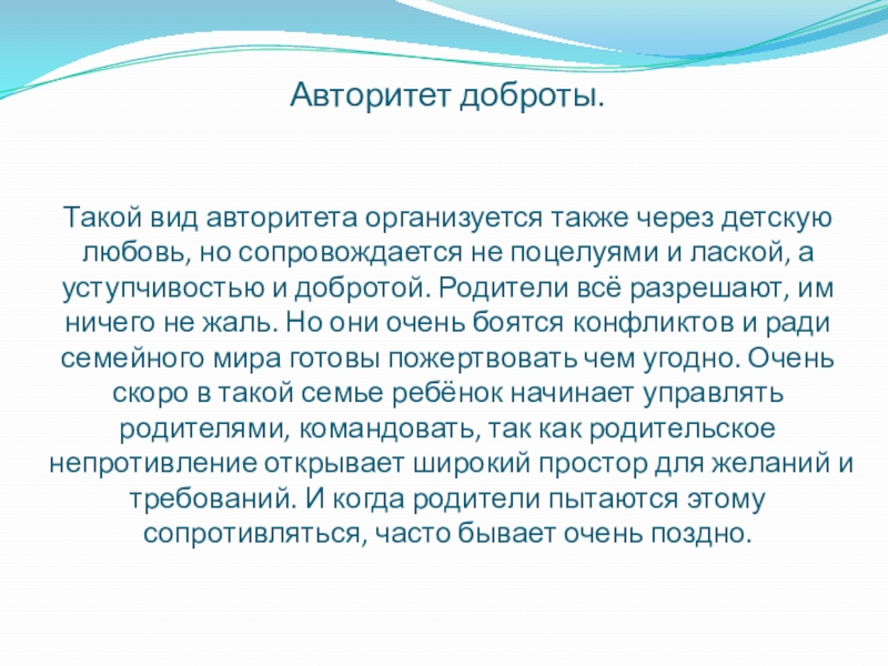 не поцелуями и лаской, а уступчивостью и добротой. Родители всё разрешают, им ничего не жаль. Но они очень боятся конфликтов и ради семейного мира готовы пожертвовать чем угодно. Очень скоро в такой семье ребёнок начинает управлять родителями, командовать, так как родительское непротивление открывает широкий простор для желаний и требований. И когда родители пытаются этому сопротивляться, часто бывает очень поздно.