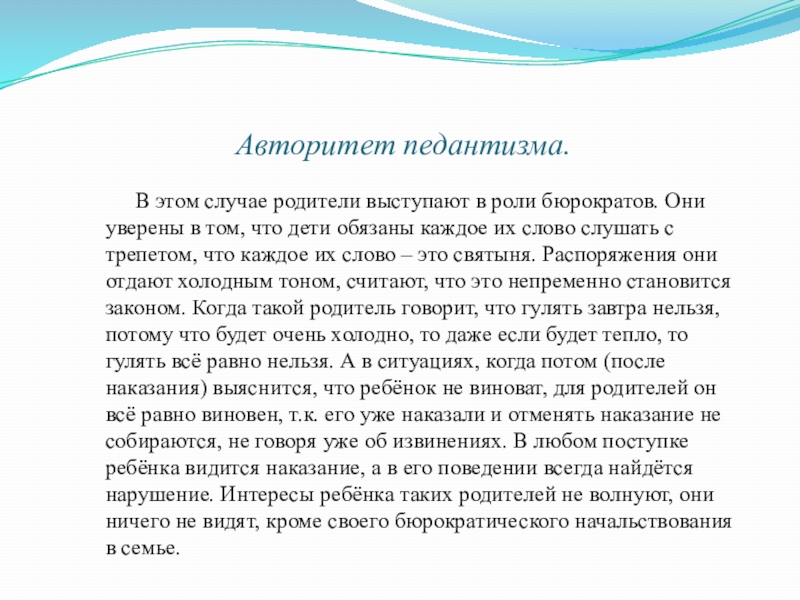 в роли бюрократов. Они уверены в том, что дети обязаны каждое их слово слушать с трепетом, что каждое их слово – это святыня. Распоряжения они отдают холодным тоном, считают, что это непременно становится законом. Когда такой родитель говорит, что гулять завтра нельзя, потому что будет очень холодно, то даже если будет тепло, то гулять всё равно нельзя. А в ситуациях, когда потом (после наказания) выяснится, что ребёнок не виноват, для родителей он всё равно виновен, т.к. его уже наказали и отменять наказание не собираются, не говоря уже об извинениях. В любом поступке ребёнка видится наказание, а в его поведении всегда найдётся нарушение. Интересы ребёнка таких родителей не волнуют, они ничего не видят, кроме своего бюрократического начальствования в семье.
