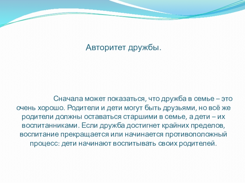 Сначала может показаться, что дружба в семье – это очень хорошо. Родители и дети могут быть друзьями, но всё же родители должны оставаться старшими в семье, а дети – их воспитанниками. Если дружба достигнет крайних пределов, воспитание прекращается или начинается противоположный процесс: дети начинают воспитывать своих родителей.