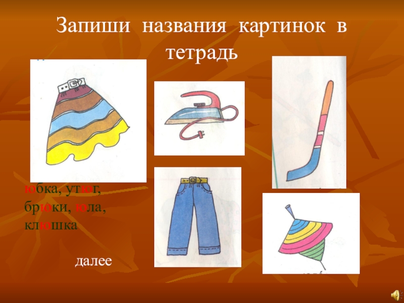 Запиши названия картинок в  тетрадьюбка, утюг,брюки, юла,клюшка       далее