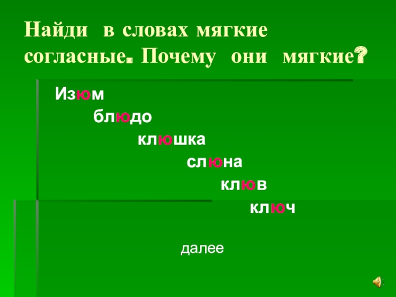 Слайд 5Найди в словах мягкие согласные. Почему они мягкие?