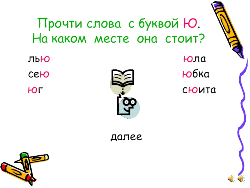 Слайд 4Прочти слова с буквой Ю. На каком месте она стоит?