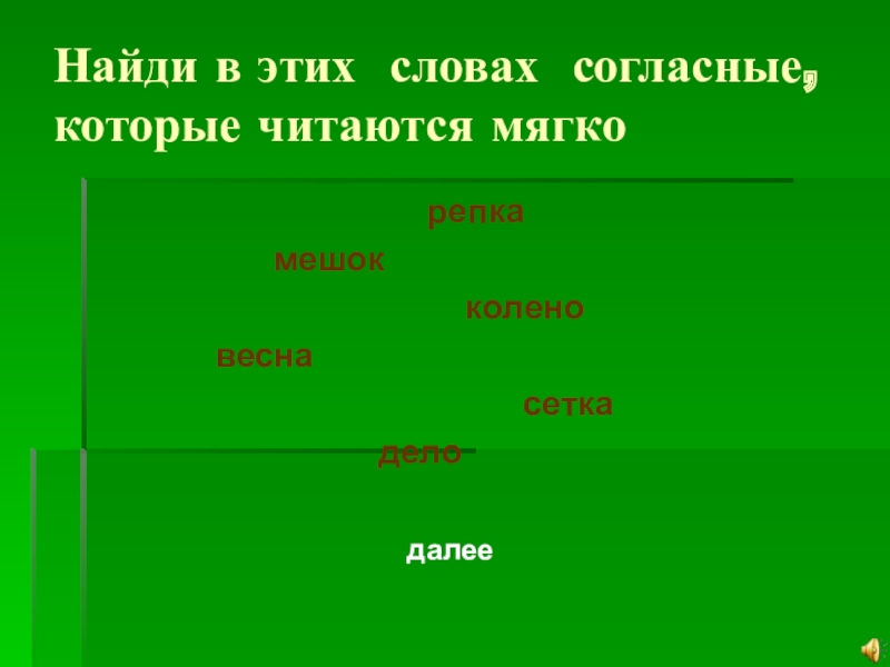 Слайд 10Найди в этих словах согласные, которые читаются мягко