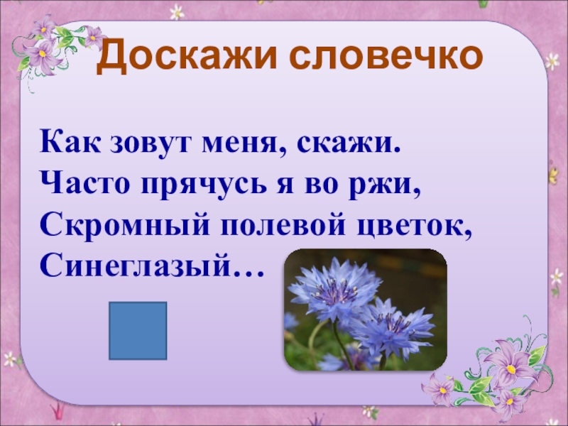 Доскажи словечкоКак зовут меня, скажи.Часто прячусь я во ржи,Скромный полевой цветок,Синеглазый…