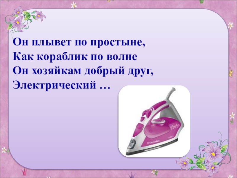 Он плывет по простыне,Как кораблик по волнеОн хозяйкам добрый друг,Электрический …