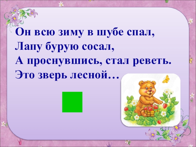 Он всю зиму в шубе спал,Лапу бурую сосал,А проснувшись, стал реветь.Это зверь лесной…