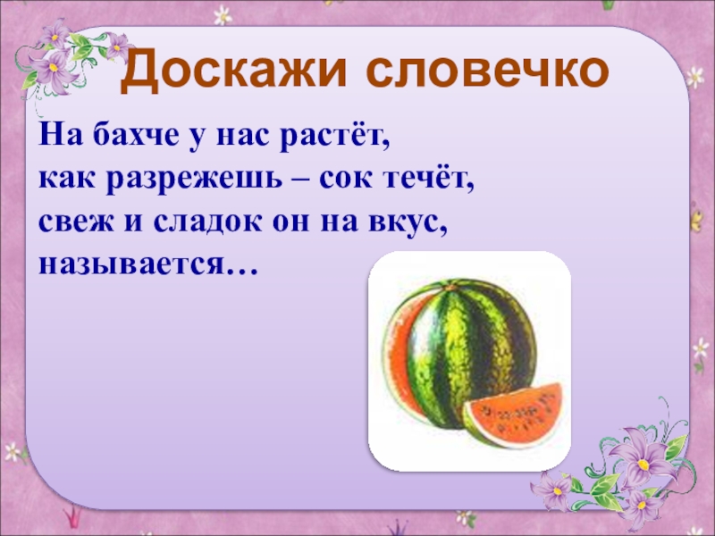 Доскажи словечкоНа бахче у нас растёт,как разрежешь – сок течёт,свеж и сладок он на вкус,называется…