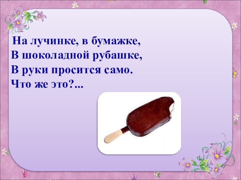 На лучинке, в бумажке,В шоколадной рубашке,В руки просится само.Что же это?...