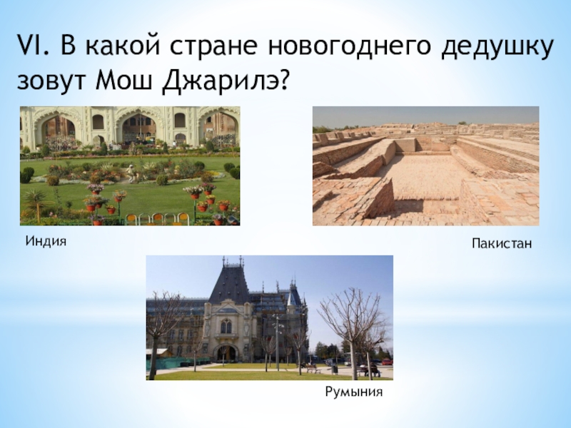 VI. В какой стране новогоднего дедушку зовут Мош Джарилэ?ИндияПакистанРумыния