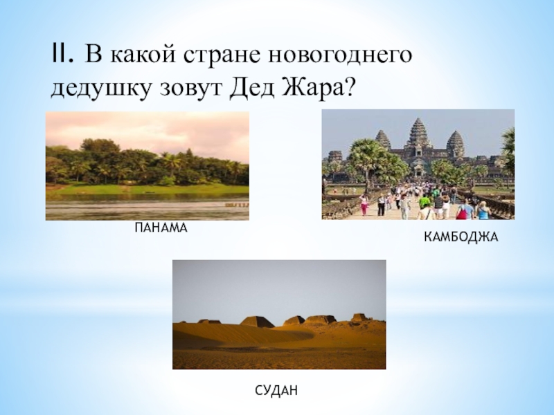 II. В какой стране новогоднего дедушку зовут Дед Жара? ПАНАМАКАМБОДЖАСУДАН