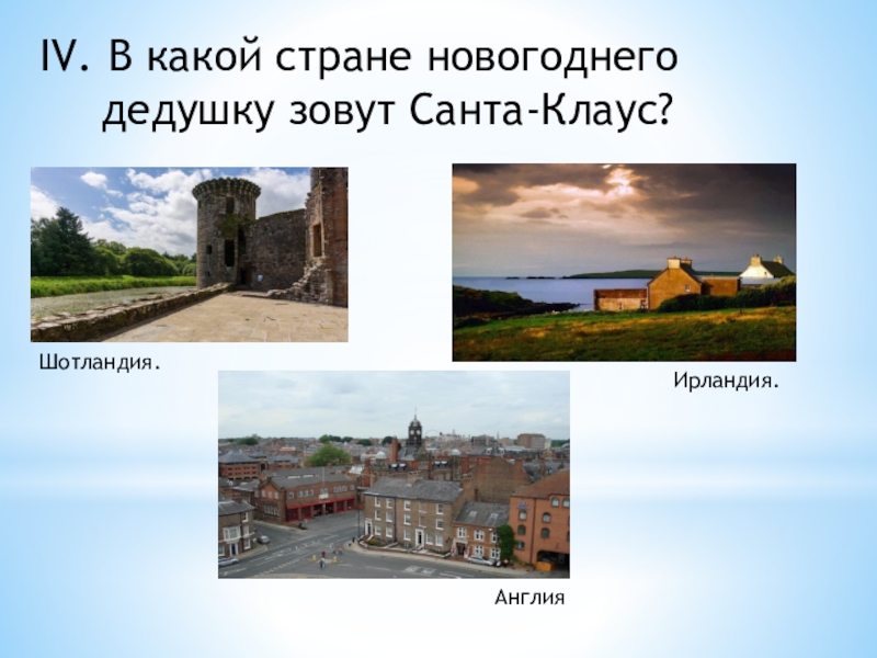 IV. В какой стране новогоднего дедушку зовут Санта-Клаус? Шотландия. Ирландия. Англия