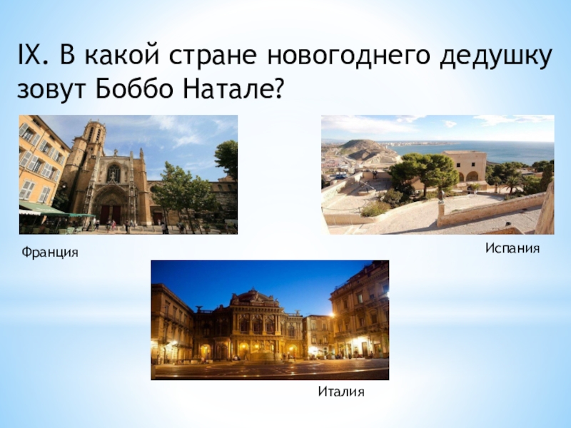 Слайд 10IX. В какой стране новогоднего дедушку зовут Боббо Натале?