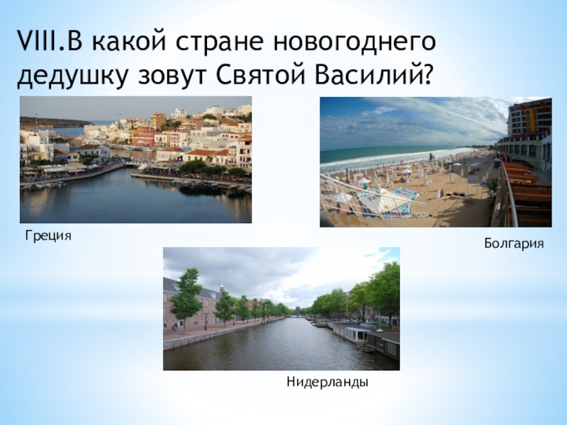 VIII.В какой стране новогоднего дедушку зовут Святой Василий?ГрецияБолгарияНидерланды