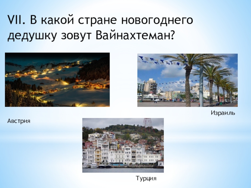 VII. В какой стране новогоднего дедушку зовут Вайнахтеман?АвстрияИзраильТурция