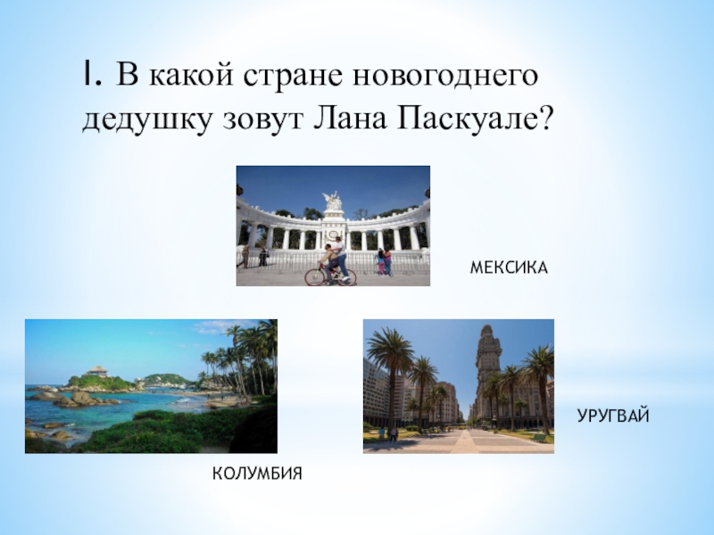 I. В какой стране новогоднего дедушку зовут Лана Паскуале?МЕКСИКАКОЛУМБИЯУРУГВАЙ