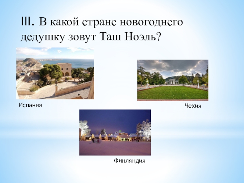 III. В какой стране новогоднего дедушку зовут Таш Ноэль? ИспанияЧехия Финляндия