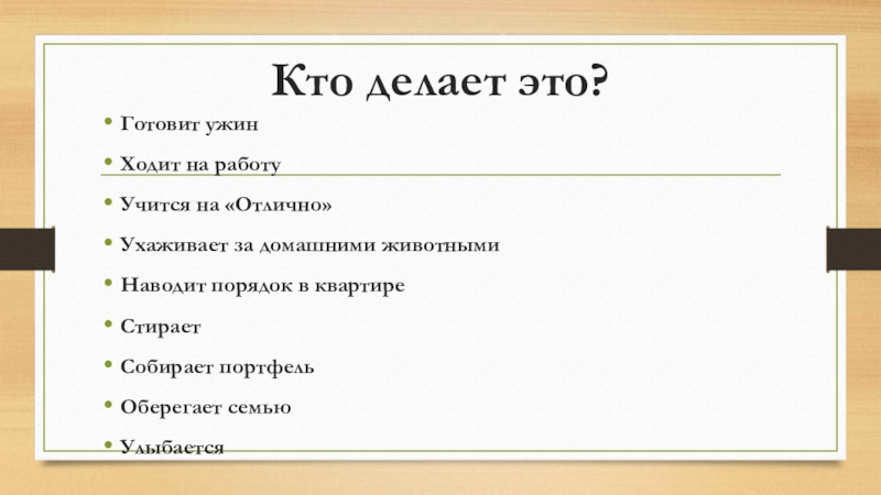 Кто делает это?Готовит ужинХодит на работу Учится на «Отлично»Ухаживает за домашними животнымиНаводит порядок в квартиреСтираетСобирает портфель Оберегает