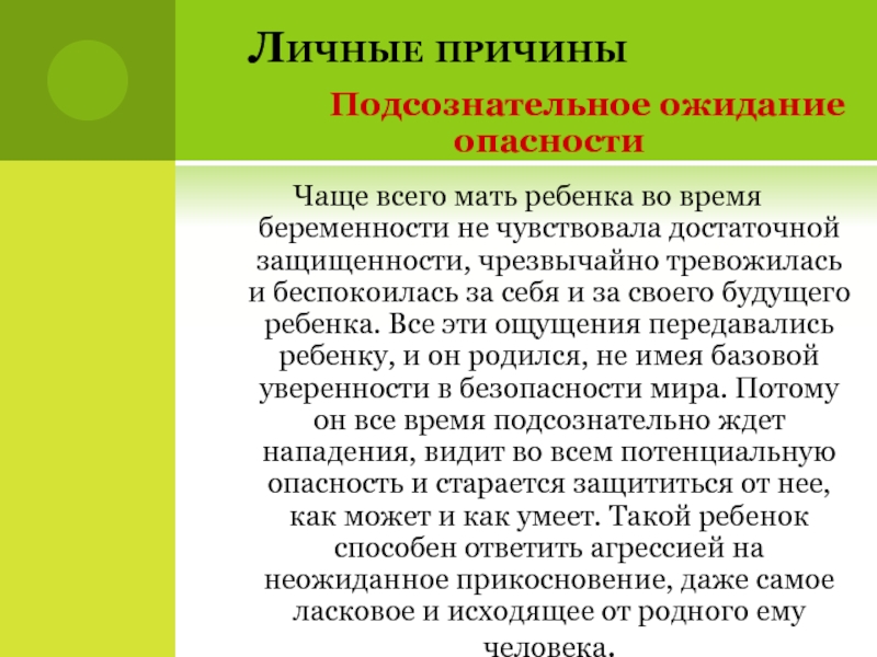 всего мать ребенка во время беременности не чувствовала достаточной защищенности, чрезвычайно тревожилась и беспокоилась за себя и за своего будущего ребенка. Все эти ощущения передавались ребенку, и он родился, не имея базовой уверенности в безопасности мира. Потому он все время подсознательно ждет нападения, видит во всем потенциальную опасность и старается защититься от нее, как может и как умеет. Такой ребенок способен ответить агрессией на неожиданное прикосновение, даже самое ласковое и исходящее от родного ему человека.